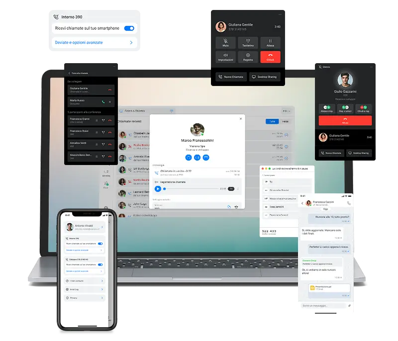 L’applicazione consente di combinare funzionalità telefoniche evolute con strumenti professionali di collaborazione come ad esempio chat, desktop sharing e videoconferenza.